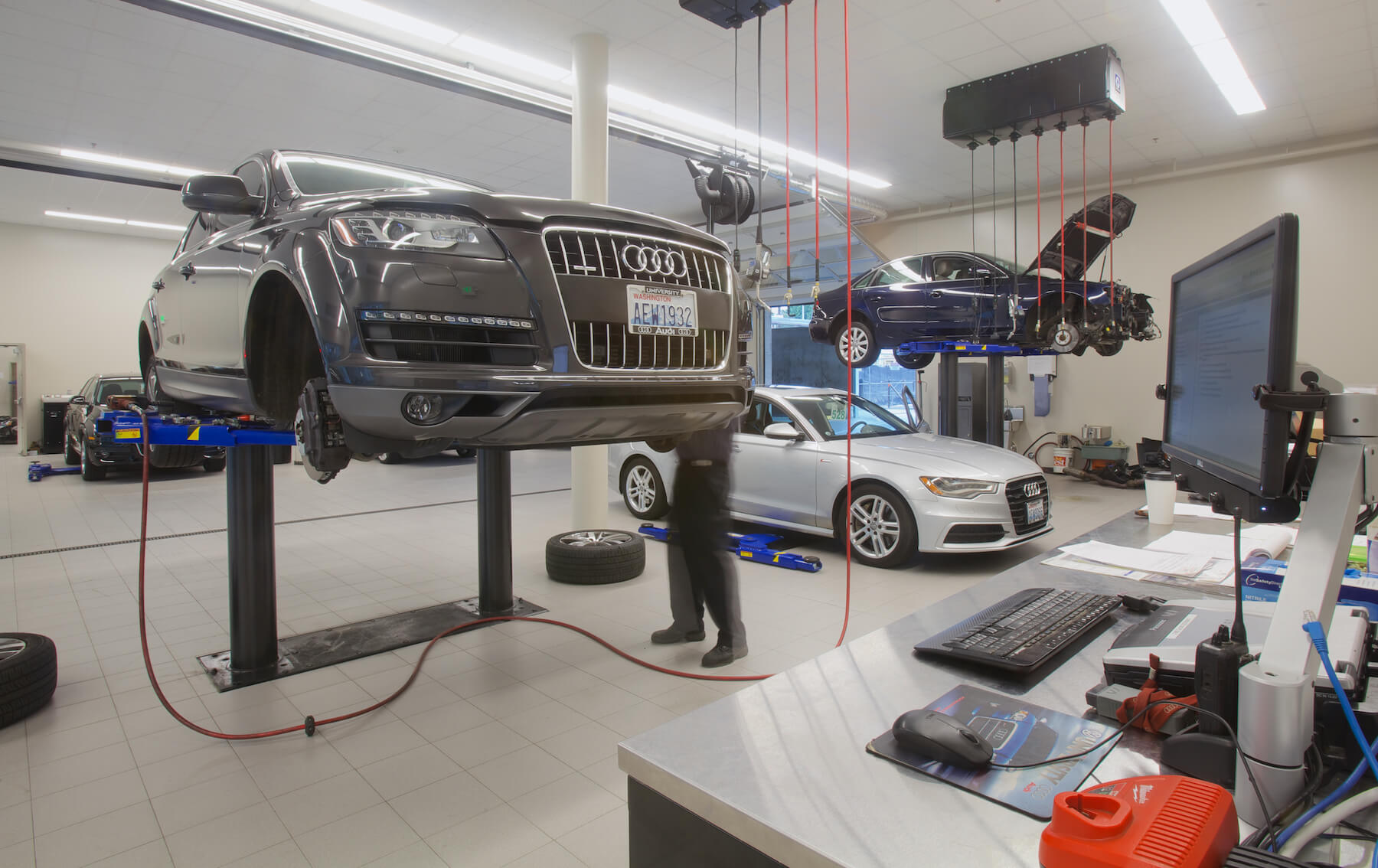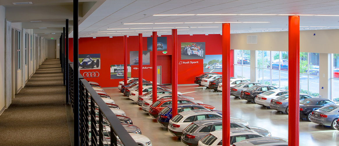 At 122,680 square feet, the expansion of University Audi includes the addition of two 41,000 square foot parking garages (one floor for sales parking and one floor for service parking storage), a 13,000 square feet indoor car display area with three 4,700 square feet service bays with a total of 30 service stations, each equipped with in-ground car lifts. The project also includes elevator and stair access to a green roof, with excellent views of downtown Seattle. The most prominent feature of the project is a 2-story helical car ramp around a 3-story radial wall that ties the entire facility together. The building’s exterior materials include glazing, board form concrete, stucco and sheet metal.Our connection with University Audi/VW goes as far back as 2000. This first project involved renovation of the 2,500 square foot Volkswagen Service Department and the 2,900 square foot Volkswagen Showroom in an existing 30 year old building. Both areas included porcelain floor tile and custom finish cabinetry in the build out. The spring 2001 Audi Dealership segment of the project followed with demolition of an existing Subaru building and constructing a 5,100 square foot two level steel structure building in its place. High end interior finishes in the Audi facility will include floor tile and finish carpentry.In 2002, Sierra constructed the 8,100 square foot main office and conference rooms building for Audi. This building featured a steel structure with mezzanine and exterior stucco finishes, as well as an exposed curved roof as the main focal point from the exterior canopy through to the showroom area. Other features included curved metal roofing, under slab ductwork, and a three bay garage area with in ground car hoists for new car displays. A 24’ high auto parts storage facility was also installed in the new building. Interior work included the build out of conference rooms, several offices and personnel areas finished with porcelain floor tile and cherry wood carpentry. During the construction process, we provided temporary facilities for Audi personnel who remained on site.