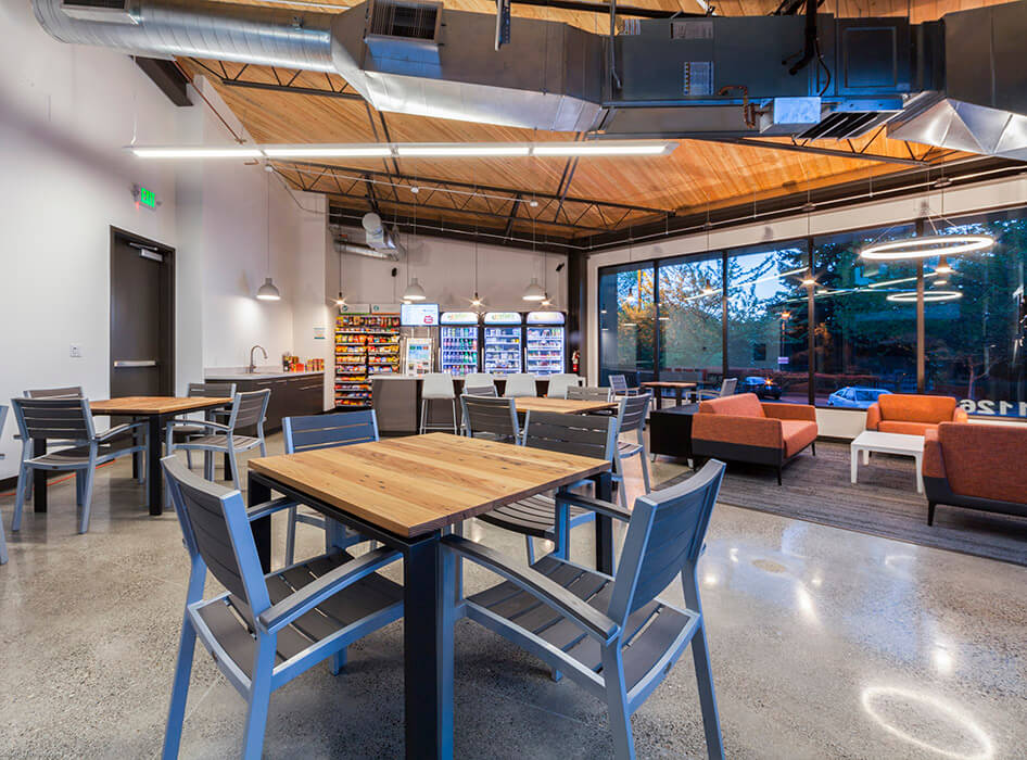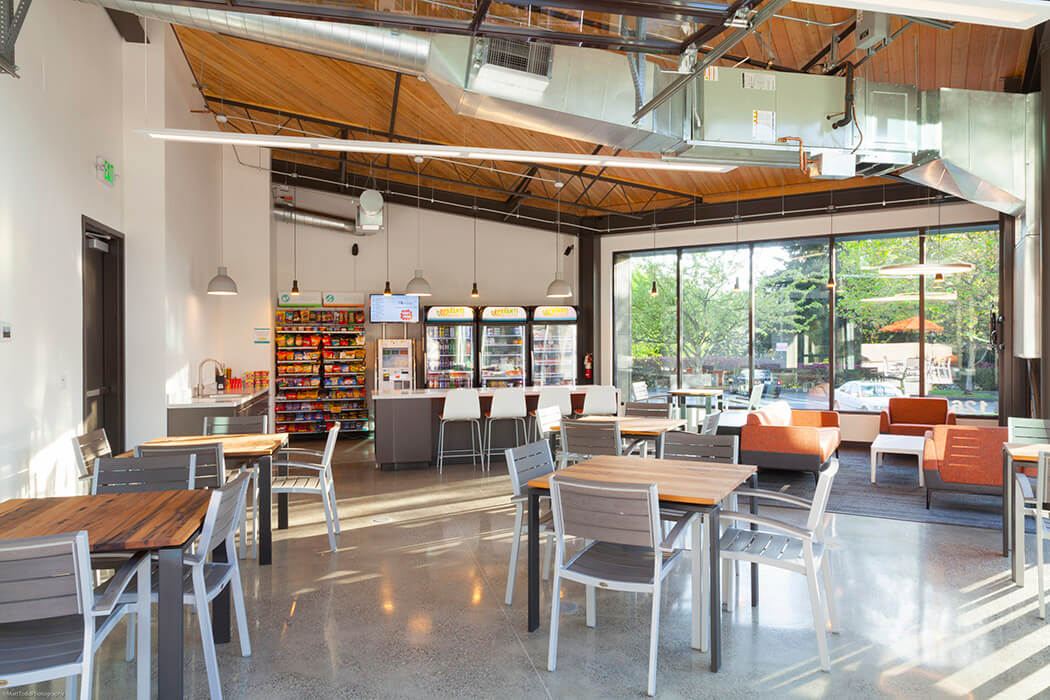 The Hub at Bell Kirk 520 is a standalone, 879 square foot great-room style structure built for exclusive use by the office park’s tenants. Offering both indoor and outdoor spaces, the Hub features an Avanti Market, roll-up door that opens to the outdoor patio space, a TV lounge and Wi-Fi throughout. Tenants will also be able to reserve space in the Hub for meetings and other uses. Schnitzer West purchased the suburban office park in 2015 and is in the process of upgrading the office buildings in addition to building The Hub.