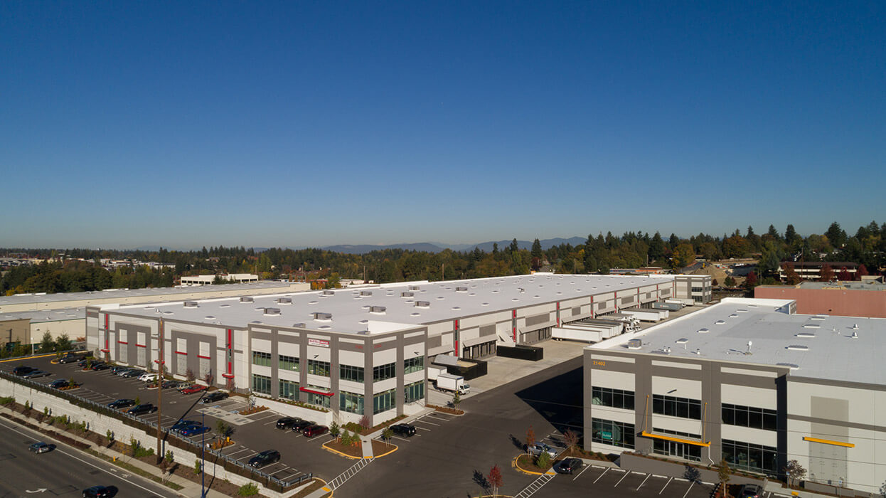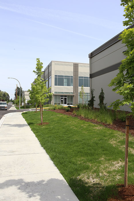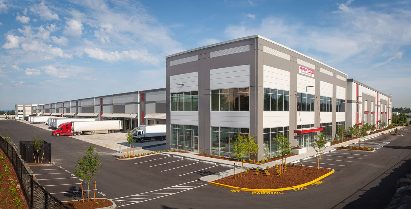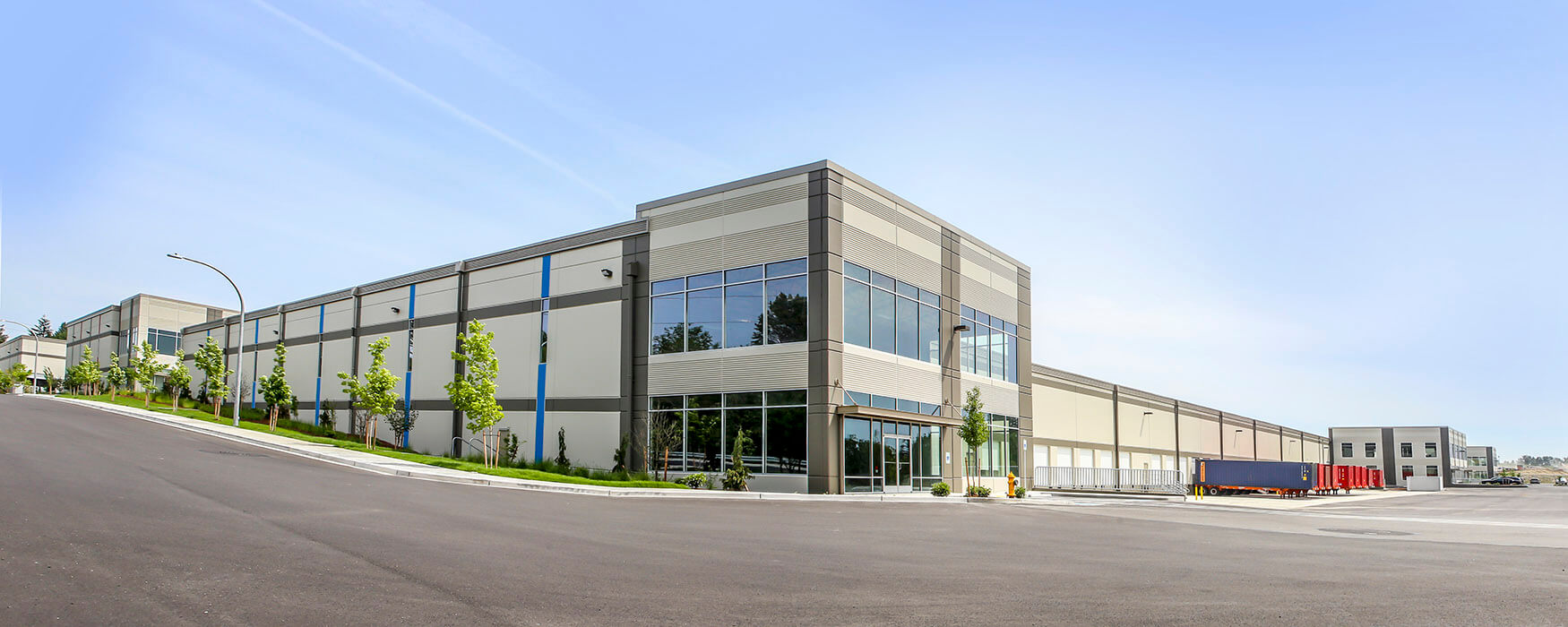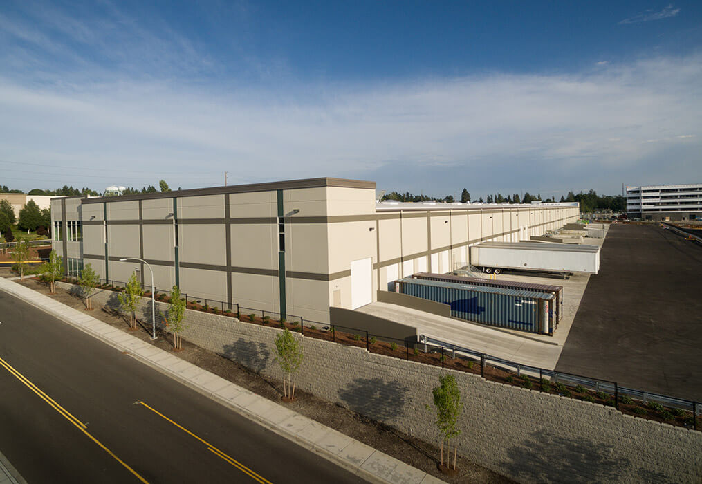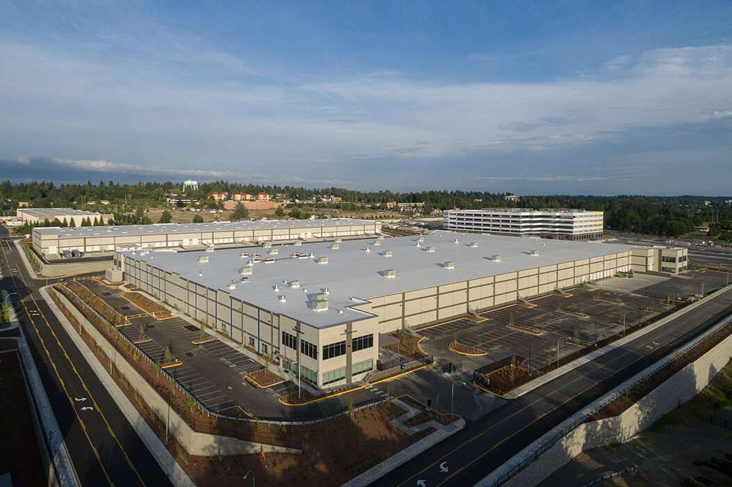 Phase 4 of the Des Moines Creek Business Park is situated on a 22.5 acre site right on Pacific Highway, which was previously occupied by Furney’s Nursery. Sitework included moving over 350,000 cubic yards of dirt and the installation of two groundwater detention tanks; 230,000 gallon onsite detention with 170,000 gallon north detention tank and wetland vault. One of the value engineering ideas that the Sierra team brought to the developer and design team was to slope the Building A slab by 0.5% due to the elevation change over the length of the site. This provided a change in elevation of three feet over the length of the building, which substantially reduced the cut-to-fill earthwork and retaining wall needed. Both buildings were built with concrete tilt-up construction, with a 36’ clear height on a 7” slab. Building 4A’s footprint building is 266,000 square feet with 45 truck doors, and the 246,000 square foot Building 4B features 34 truck doors.