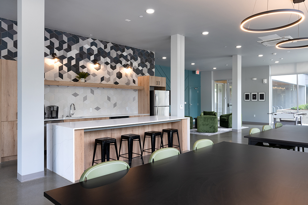 At the ground level Eclipse Fremont features four live/work units, a large fitness room, 3,000 square feet of community space for tenant use, and landscaped courtyards. With sustainability in mind, the project includes a 29kW rooftop photovoltaic installation. The roof deck also features over 9,000 square feet of amenity space to tenants, which includes a children’s play area.