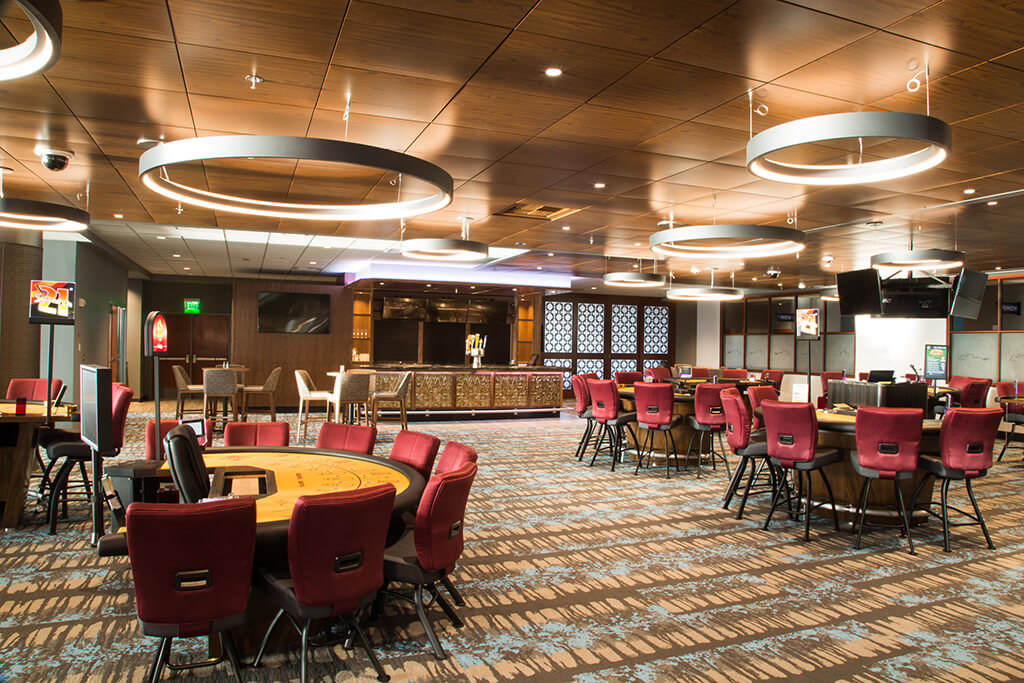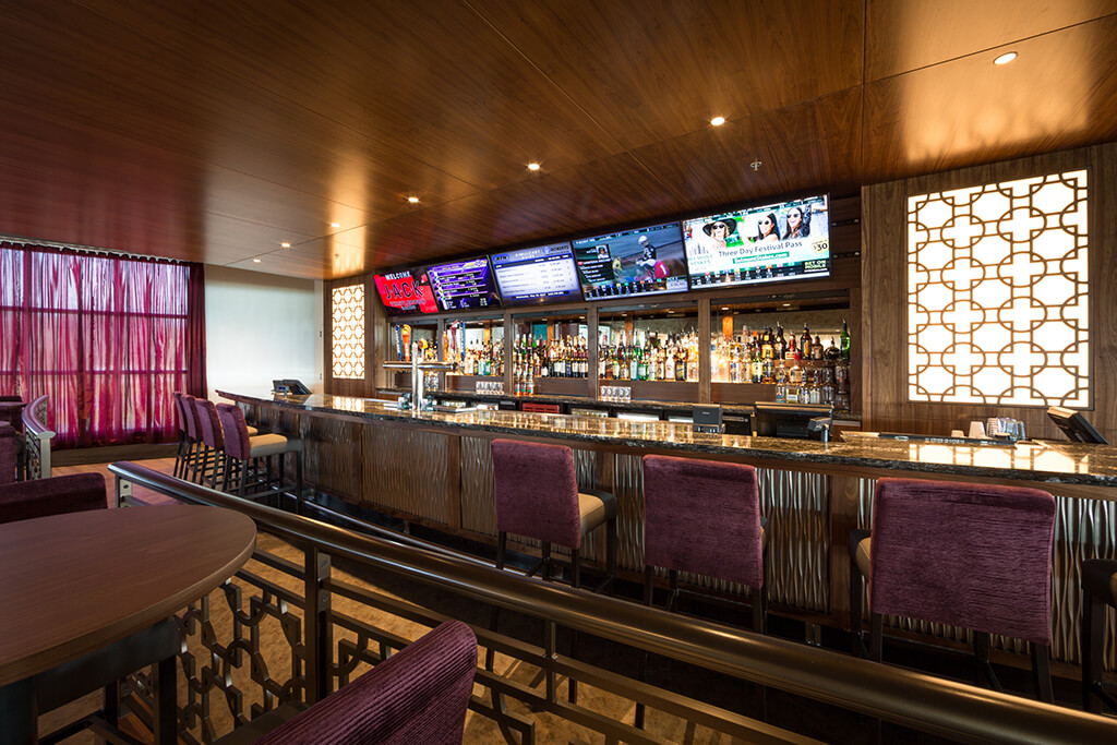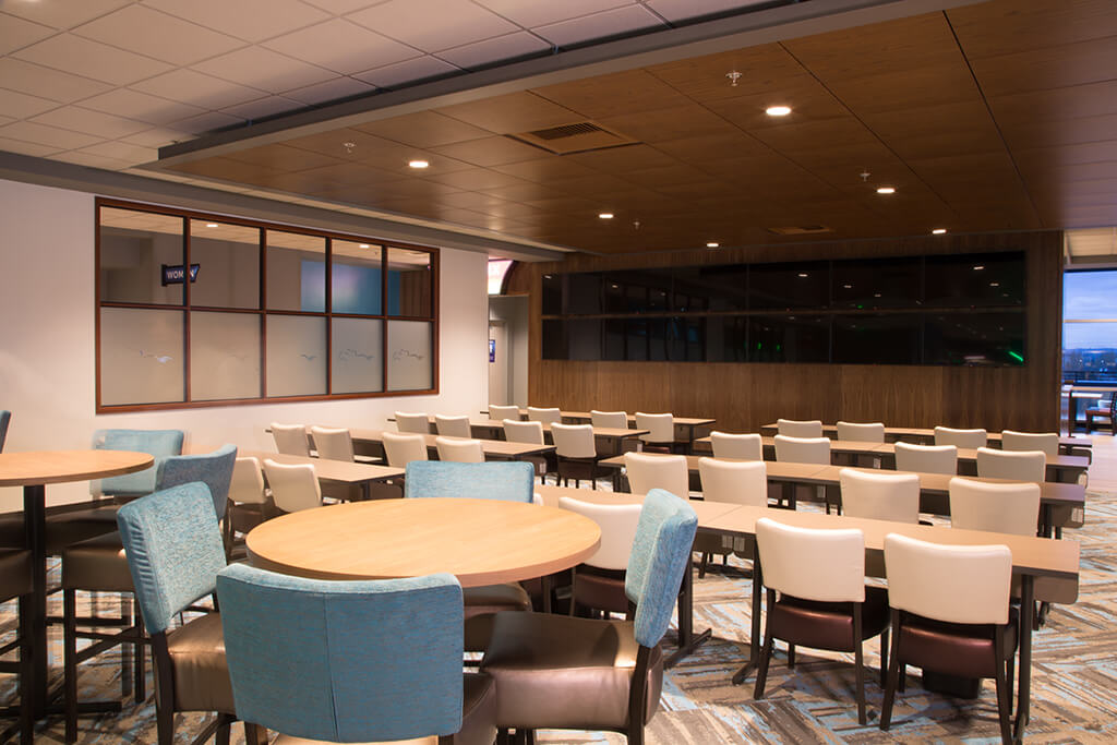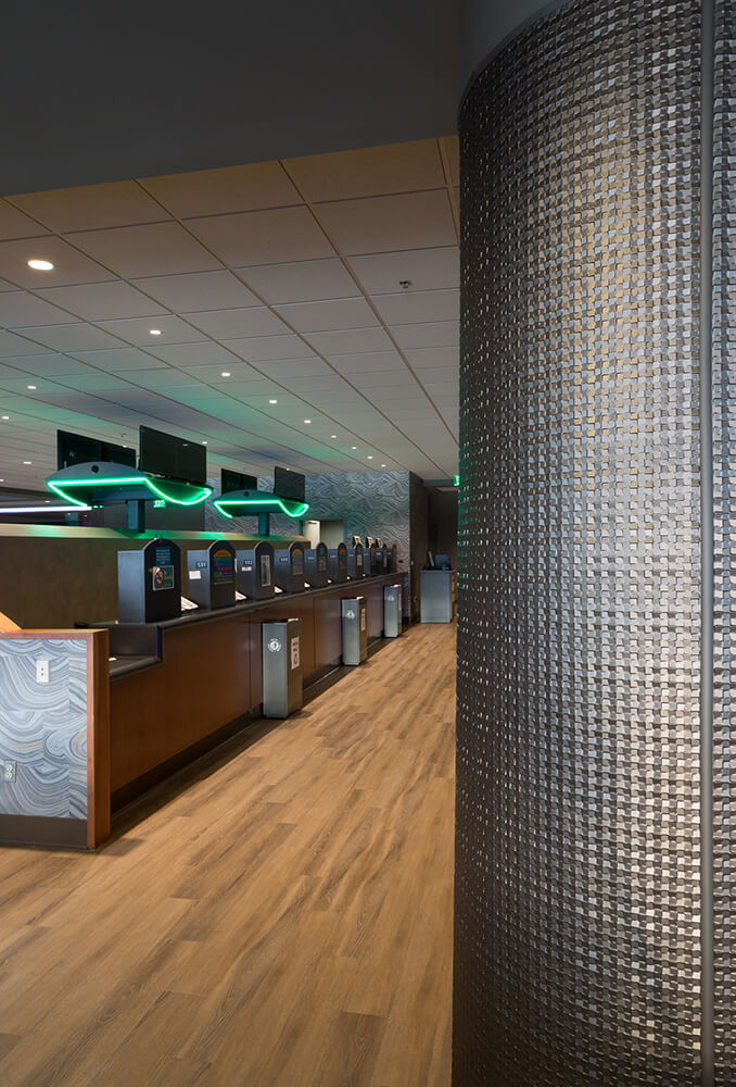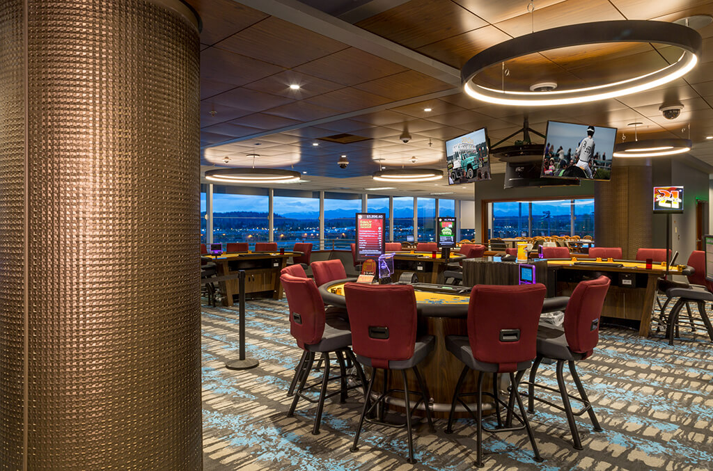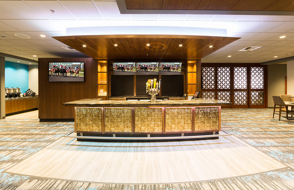 The Emerald Downs 5th floor renovation of Turf Club converted the entire 26,000 square foot level from a cafeteria and general seating area into a modern clubhouse bar, lounge and casino. The Card Room layout was reorganized to accommodate up to 15 tables the casino, while still providing an intimate and comfortable space. The Card Room bar received a significant renovation, complete with quartz countertops, high end finishes and accent LED lighting. The Central Bar was completely renovated, including the addition of a stage and media wall, creating a central social feature for the entire floor. The removal of the wall separating the elevator lobby and the Central Bar also created a more welcoming open entry for arrival. The old concession area was repurposed to provide a modern café experience with appliance and finishes upgrade, providing a more convenient general food service for the fifth floor. The scope of work for the entire level also included new flooring, wall finishes, wrapped columns, as well as specialty ceiling design to accommodate new lighting fixtures and surveillance control.