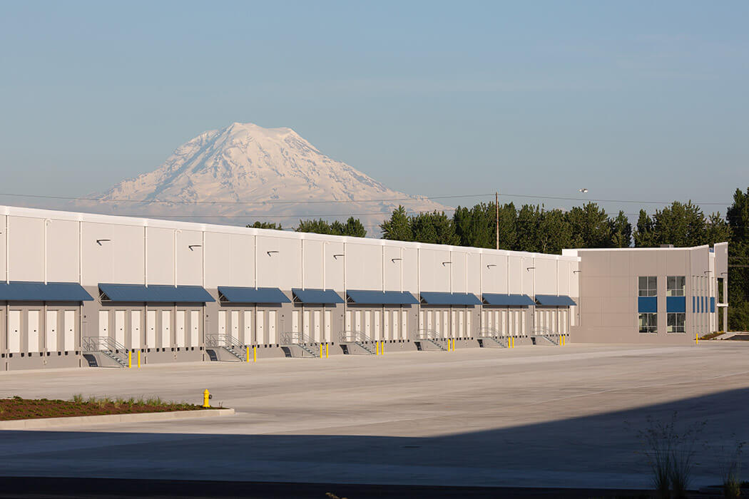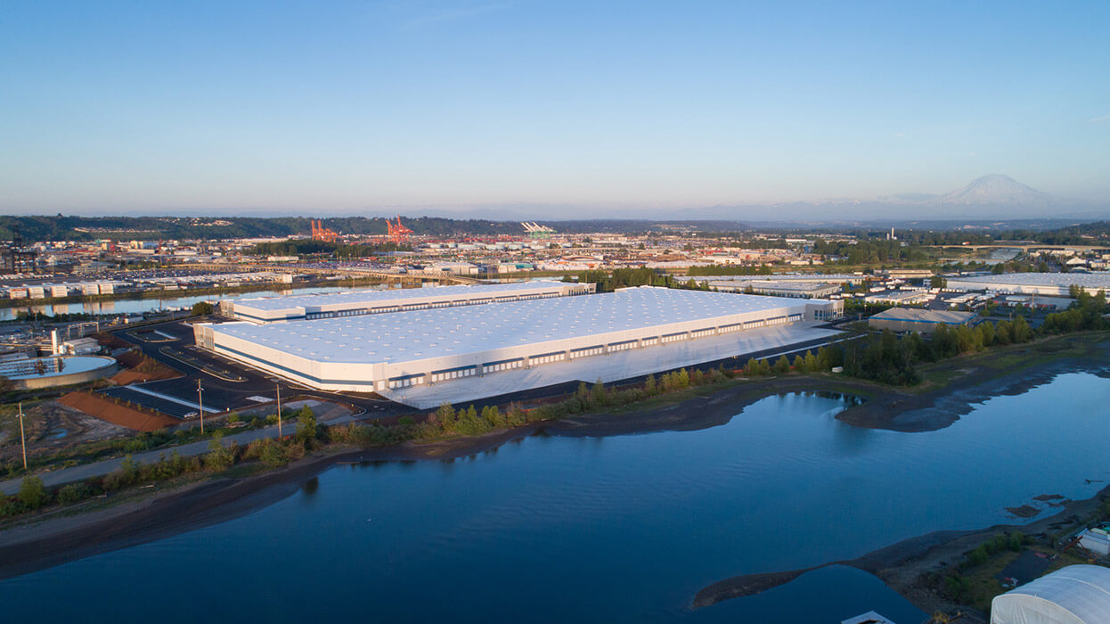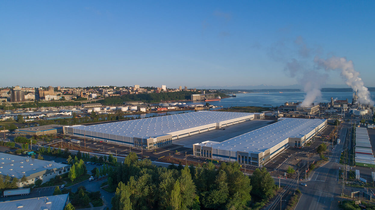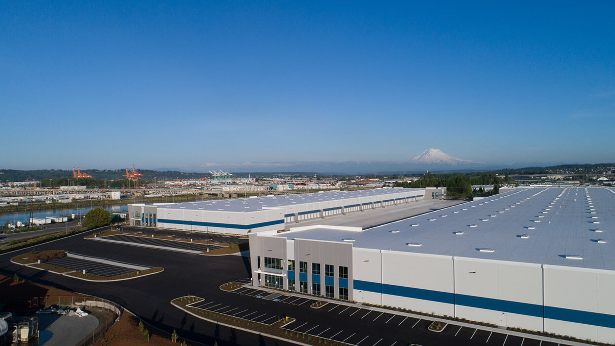 Sitework began in 2016 on a 58 acre site in the Port of Tacoma. Previously the site of the Simpson Lumbermill, sitework included demolition of buildings. The site was also mostly paved. This industrial development is much needed, with a historically low vacancy rate in the area. The completed project will add over a million square feet of industrial warehouse. Building A will be 280,525 square feet with a 32′ clear height, plus a 3,000 square foot mezzanine over 3,000 square feet of finished ground floor for office space. Building B will stand at 828,620 square feet with a 36′ clear height, which will have a 6,000 square foot mezzanine over 6,000 square feet of finished ground floor for a total of 12,000 square feet of office space. Building layouts can provide tenant spaces as small as 60,000 square feet. Watch this project from start to finish