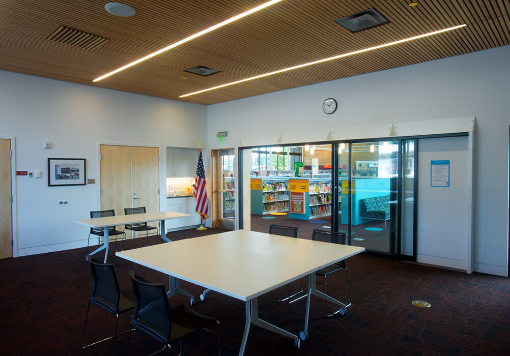 The building design is centered around an open reading room – as a civic gesture of welcoming community space.It features an innovative and delicate tension-rod truss system that clear spans the 72-foot by 90-foot room.