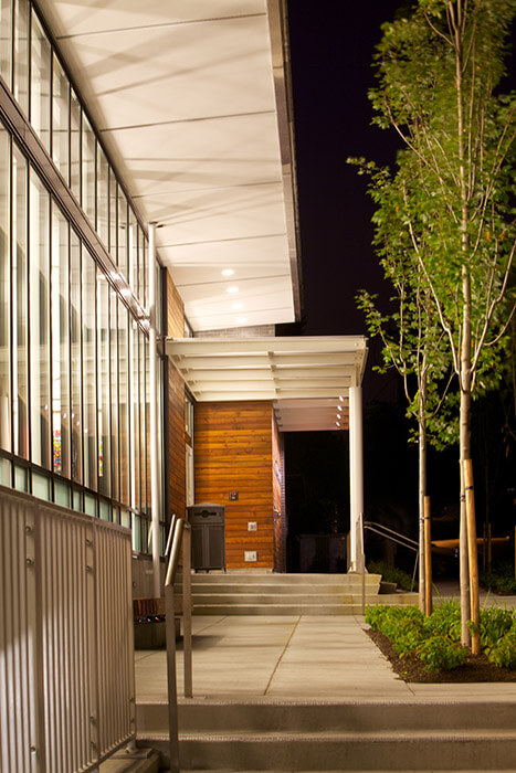 A public plaza to the north enlarges the civic space of the sidewalk, connecting the library to the downtown core. A large viewing garden of sculpted landforms and native plantings buffer the reading room from the highway to the south. Landscape rain gardens provide on-site infiltration of rainwater to improve ground water quality and reduce surface water run-off into nearby Lake Washington. Additional site improvements include right-of-way and sidewalk upgrades and undergrounding of existing overhead utilities, both at the library site and at adjacent properties.