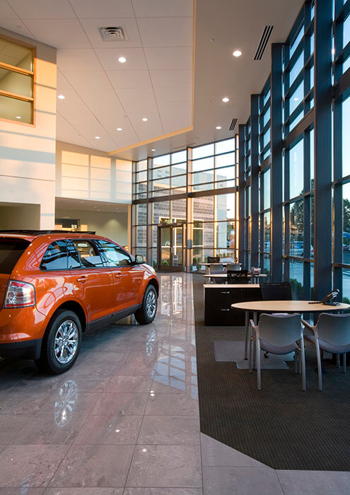 The building was designed by Helix Architecture, following Fordland’s initial design concept. Sierra was selected as contractor very early on, with beneficial results in constructability and cost-effective design throughout the process. The structure is constructed of integrally colored CMU, with steel roof joists and TPO roofing. There are Alucobond metal panels accenting the radiused “wing” on the front of the dealership to create its identity. Set on a 7 acre site with a very well lit sales lot, the dealership shows well both night and day.
