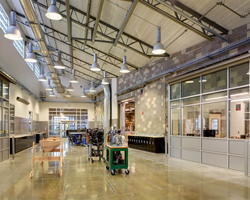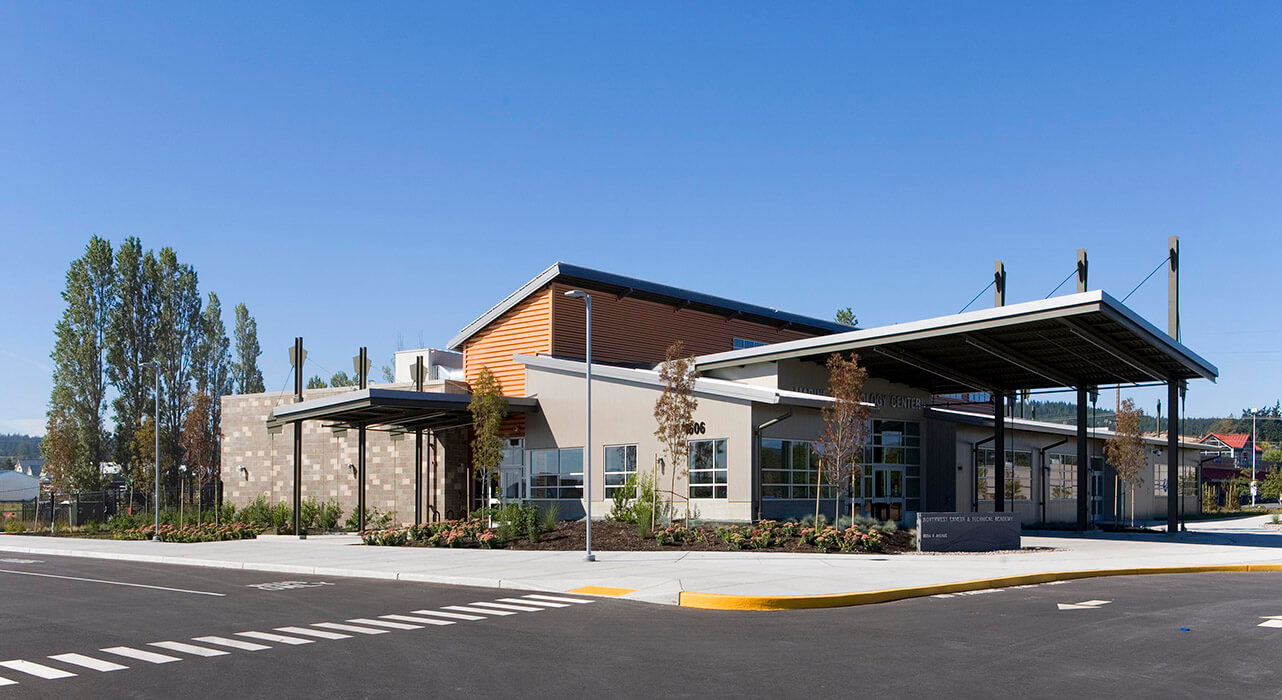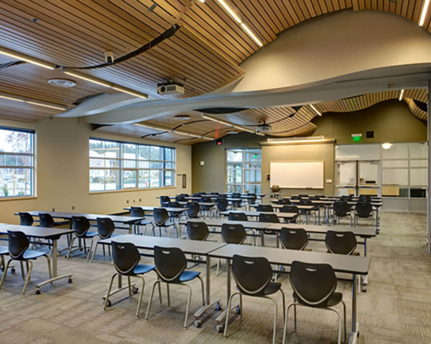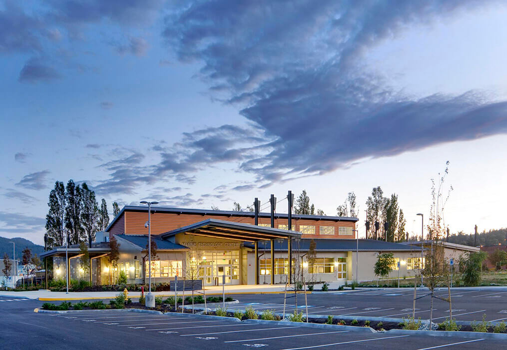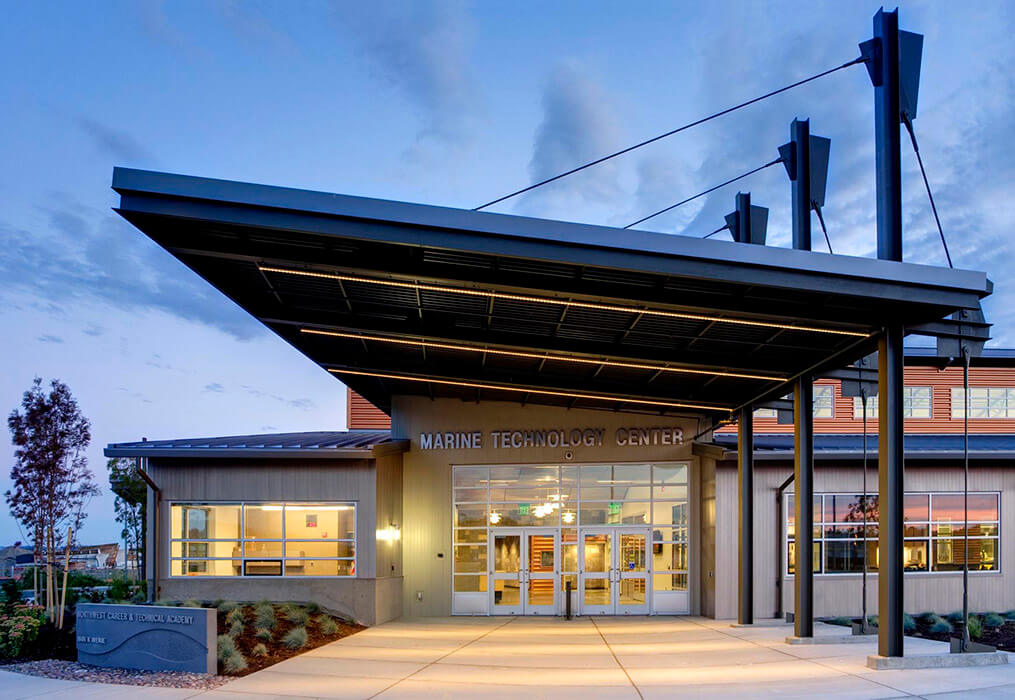 This technical school and classroom building consists of CMU and structural steel with metal wall panels. The marine technical center will house classroom, lab and shop space and includes a clere-story down the length of the center of the building to allow in light as well as provide room for boats to be hoisted overhead in the mechanics area. The technical school and classroom building’s exterior includes a cable supported cantilevered canopy for architectural detail. The Academy was built under the Washington Sustainable Schools Protocol, a program similar to LEED. A vertically bored geothermal heating system consisting of fifty 340’ deep wells was installed to relieve the building of the need for natural gas. The project includes 213 solar panels to create an output of 48KW, the largest photovoltaic system in Washington State at this time.
