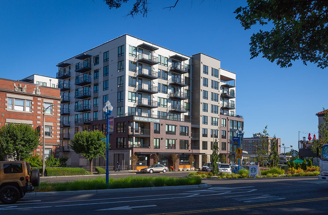 Breaking ground in August 2016, Stadium Apartments is a 220,000 square foot mixed-use building located in the Stadium District of Tacoma. The building has 172 residences varying from studio, 1 and 2 bedroom units. Stadium is 10 stories total; 7 above grade, and 3 below-grade parking levels. Some units also feature high ceilings, patios and balconies, floor-to-ceiling windows and walk-in closets. A unique feature to Stadium is the outdoor covered community room on the 7th floor with expansive Puget Sound views, fully equipped with entertainment and lounging, as well as barbecue. Although this project was not LEED certified, it was completed with Green Build in mind including Energy Star appliances, LED lighting, low flow plumbing fixtures and a recycling program. The project also has 2,260 square feet of retail space and offer 204 parking spaces. Stadiums location places it near Wright Park, local grocery store Stadium District Thriftway, street-side to future Light Rail stop as well as multiple restaurants and coffee shops, making it an excellent option for the modern urban resident.
