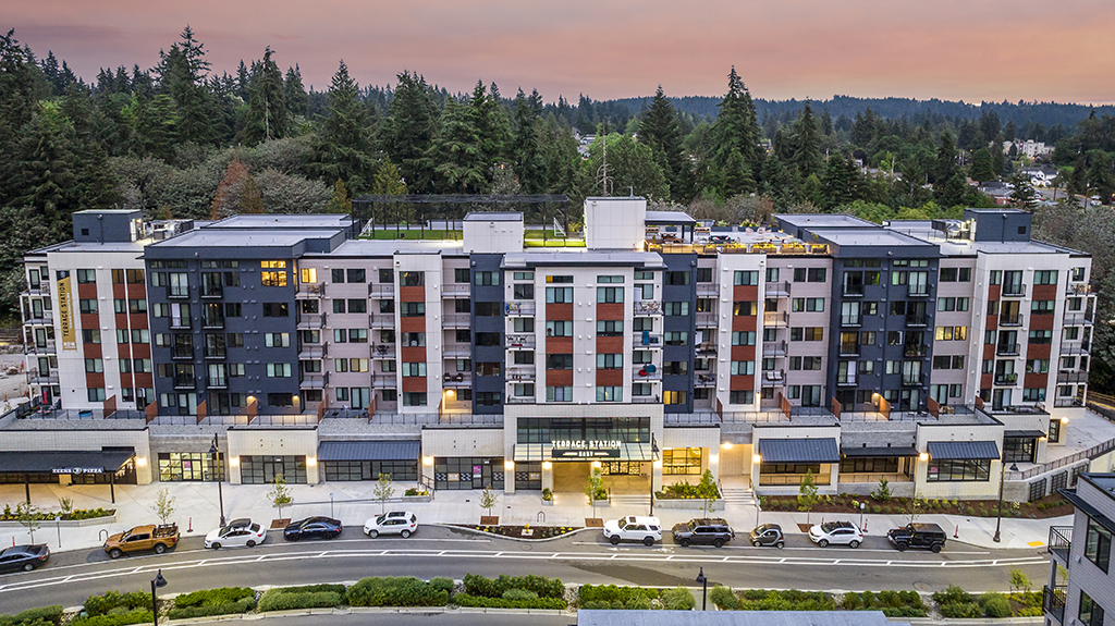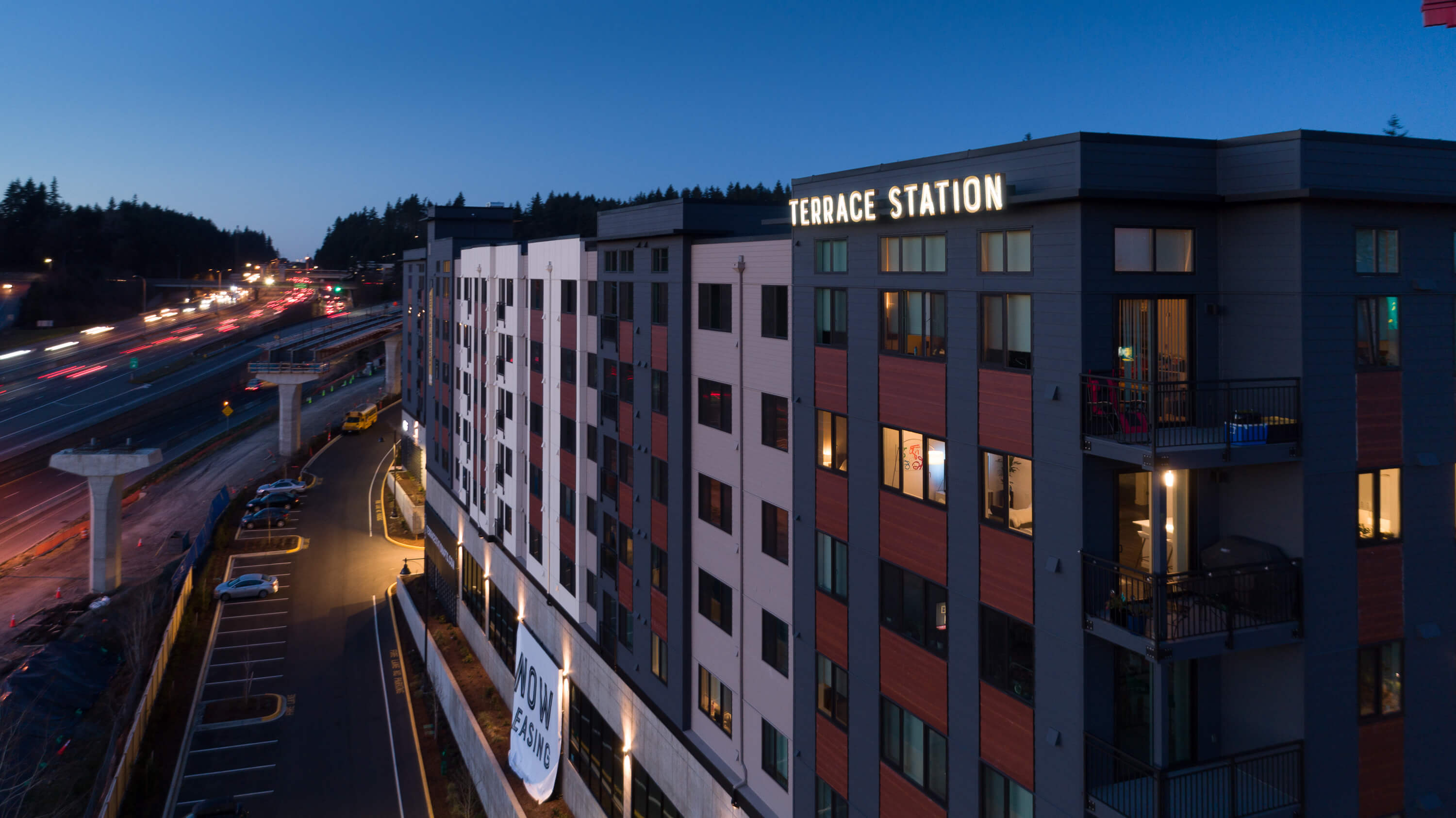 The two-building Terrace Station Transit Oriented Development (TOD) is located adjacent to the Transit Center Park & Ride along I-5 in Mountlake Terrace, WA.