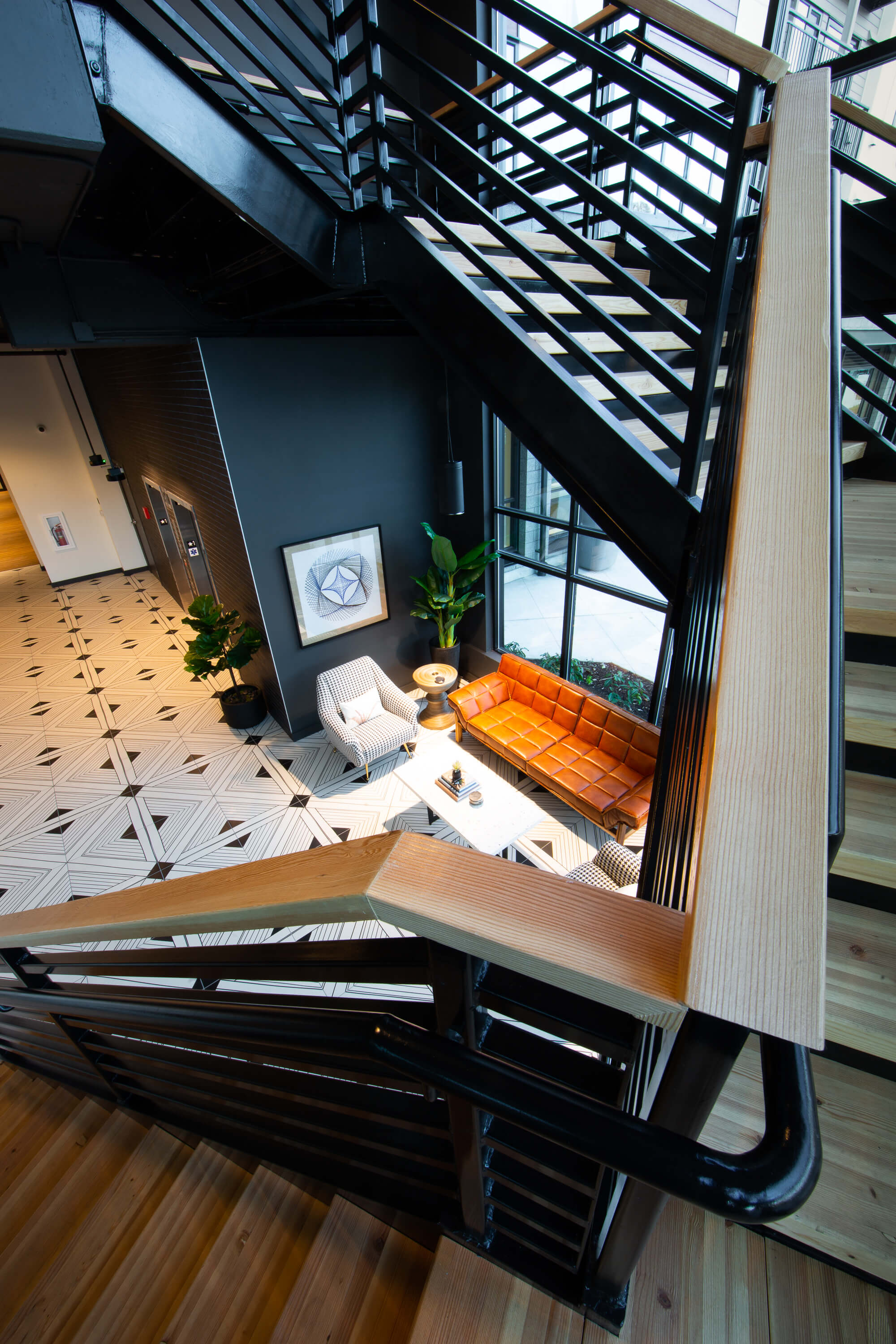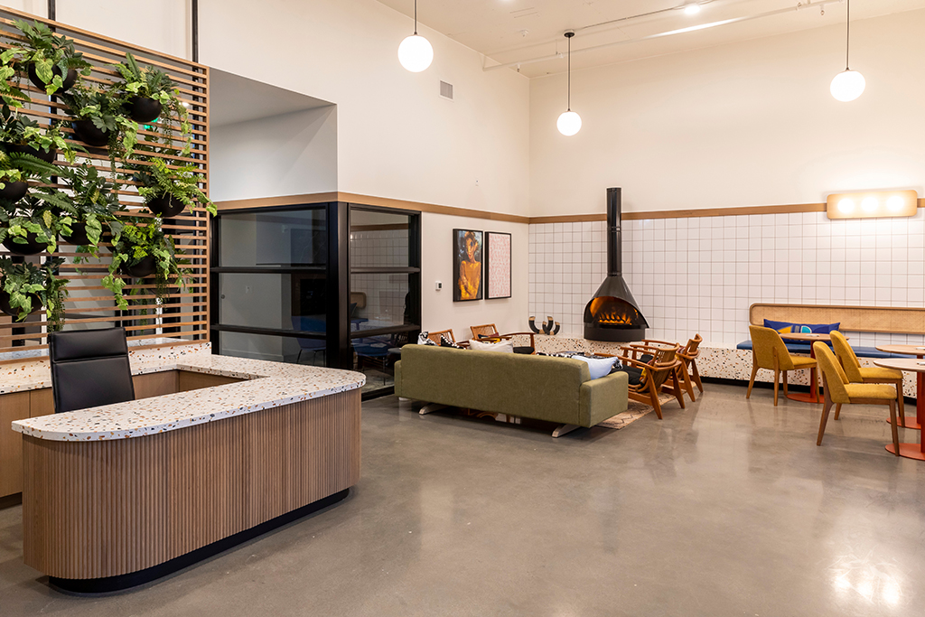 Terrace Station East is a seven-story 224,364 square foot building has 168 residential units. East also features a roof top deck with barbeques and fire pits along with a dog exercise and relief area, and a multi-purpose sports cage. At street level, the residents have access to flexible work and conference spaces. Another unique feature to Terrace Station East are built-in pot racks located above kitchen sinks. Tenants and the public can utilize 16,000 square feet of ground floor retail, which currently includes a Zeek's Pizza.