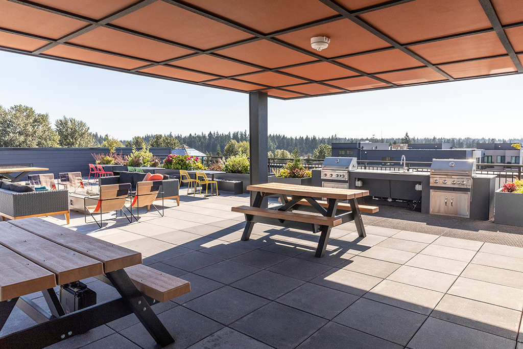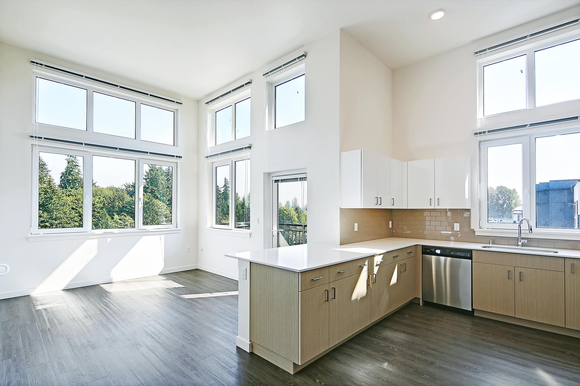 The project approached sustainable design using the Integrated Design Process and included energy, mechanical, electrical, and plumbing consultants right from the start. STC 40 rated ECO windows were used for the project on all exterior walls that would be impacted by the noise from Light Link Rail and I-5. The building orientation, window placements and sizes were maximized for both daylight and ventilation. The number of Electric Vehicle charging stations installed set a milestone record for multi-family buildings in the Pacific Northwest and are expected to reduce carbon emissions. Tenants were provided ample bike storage rooms for both short- and long-term use. The complex has bike routes connecting to bike trails around the area and to retail shopping and the nearby transit station.